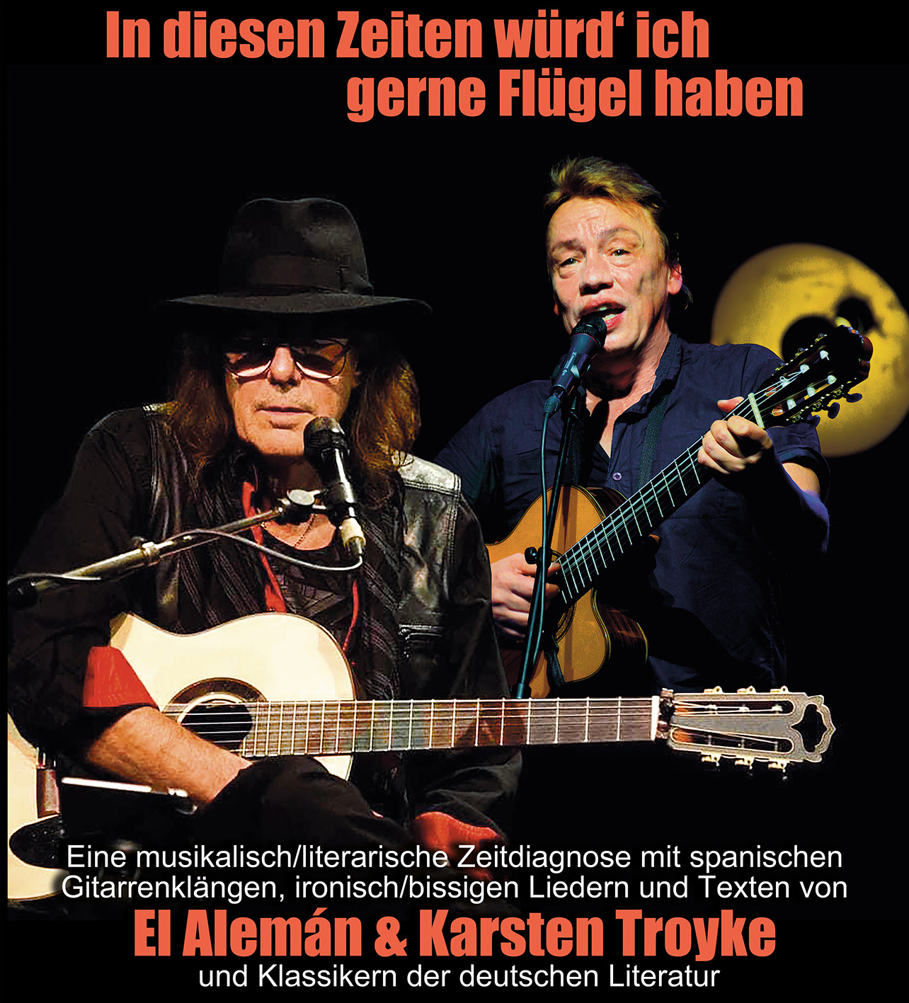 Das neue Konzertprogramm „In diesen Zeiten würd‘ ich gerne Flügel haben“ mit El Alemán und dem bekannten Sänger, Schauspieler und Entertainer Karsten Troyke. Eine musikalisch/literarische Zeitdiagnose mit spanischen Gitarrenklängen, ironisch/bissigen Liedern und Texten von El Alemán und Klassikern der deutschen Literatur.